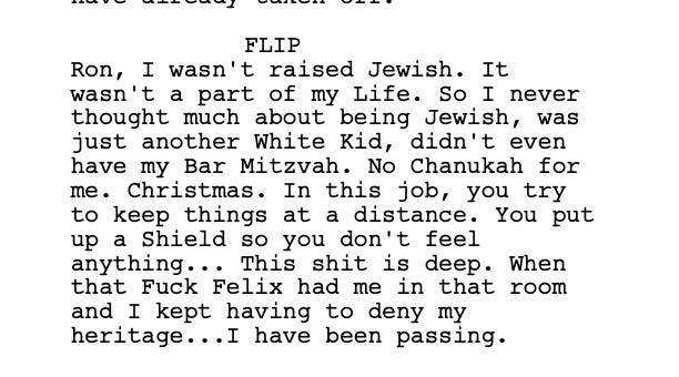 But in the film, it's condensed as, “I’m Jewish, yes, but I wasn’t raised to be. I was just another white kid...” Nothing about passing. Instead it ends with the line: "I never thought much about it and now I'm thinking about it all the time." Seems like every white guy I know has expressed something similar to me in the past couple of years — this feeling of becoming newly aware of having an identity; a privileged identity, but an identity all the same (white and jewish, or white and dyslexic, or just white.) It is a feeling that is hard to express, but that sentence — “all the time” — encapsulates part of it. Having an actor like Adam Driver, in all his driverness, deliver it with that searching affliction, really cuts to the core. Obviously the movie is not just about a white person figuring out their whiteness, but that’s who tends to vote for gold trophies. I haven't thought about the movie much since I saw it, but I've thought about that line.